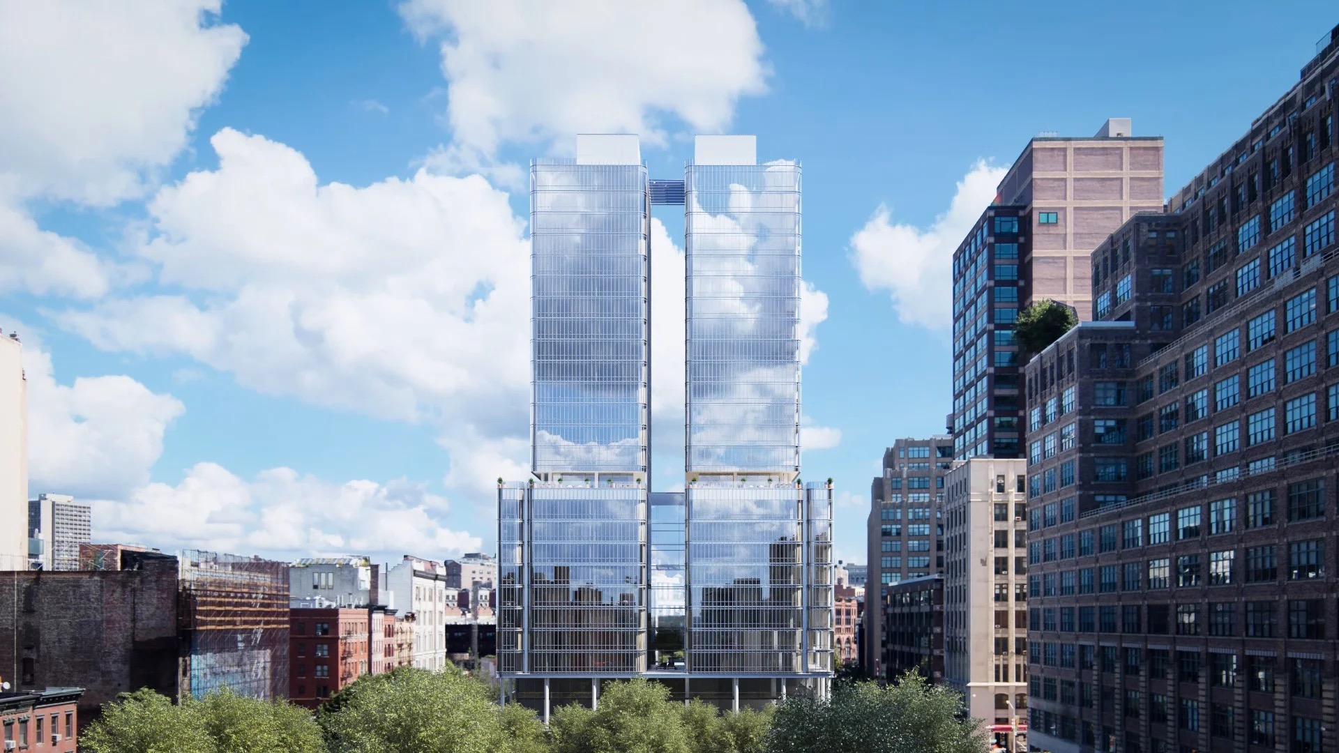 The building consists of two 30-story glass towers connected at a shared base. The facade features floor-to-ceiling glass panels set in a refined structural grid that gives the towers an ethereal, light-filled quality. Piano designed the buildings to capture the characteristic SoHo light that has attracted artists for generations. Interiors are clean and contemporary with open layouts, high ceilings, and premium finishes. Select units include private outdoor terraces. The overall effect is one of quiet sophistication and transparency.